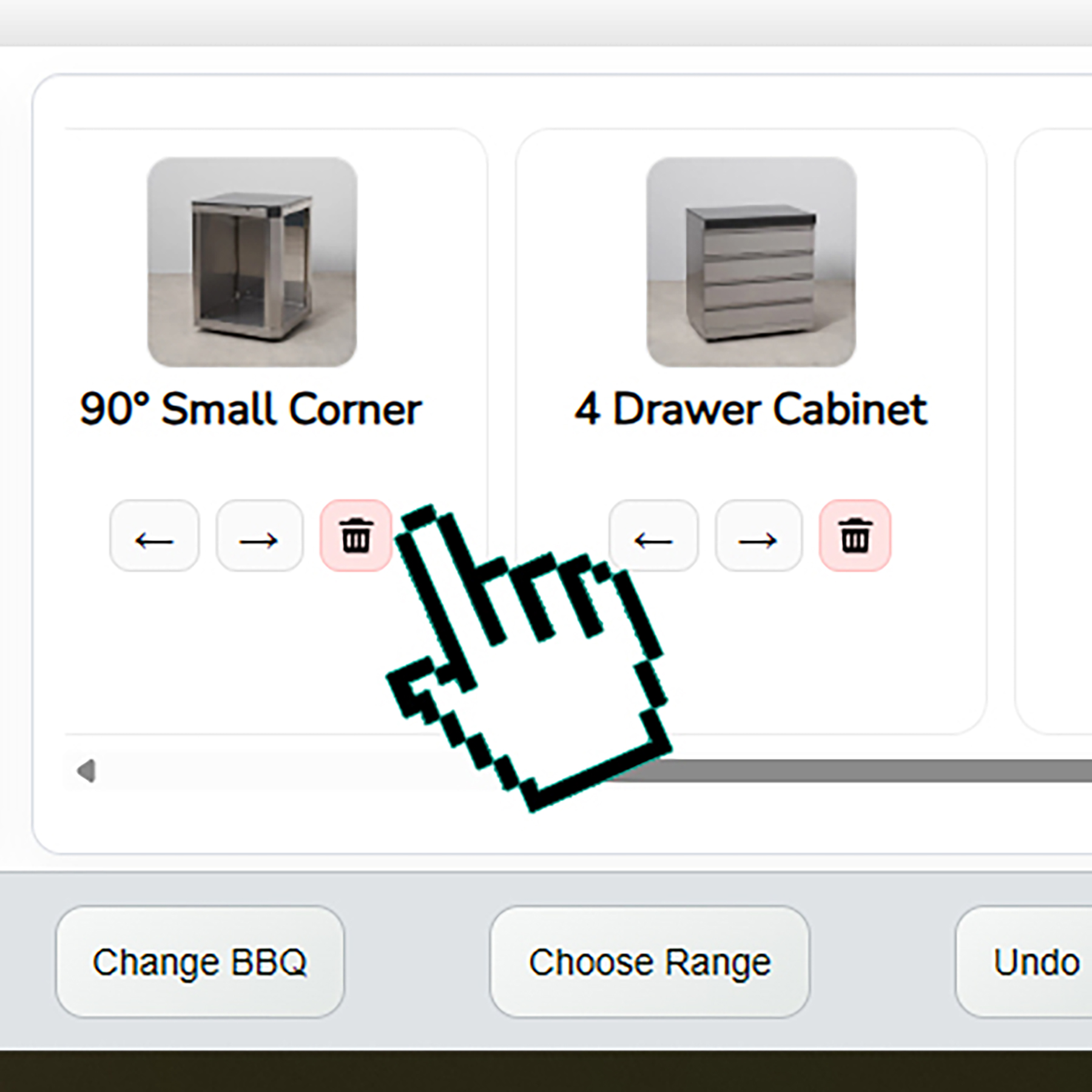 Tap Add to Left or Add to Right in the bottom bar. A list of unit cards opens. Tap the picture or title you want, then tap Add. The unit will appear next to the BBQ in the 3D scene and you will see its tile show up in the Kitchen Info strip (the bottom/right list of units in your scene).